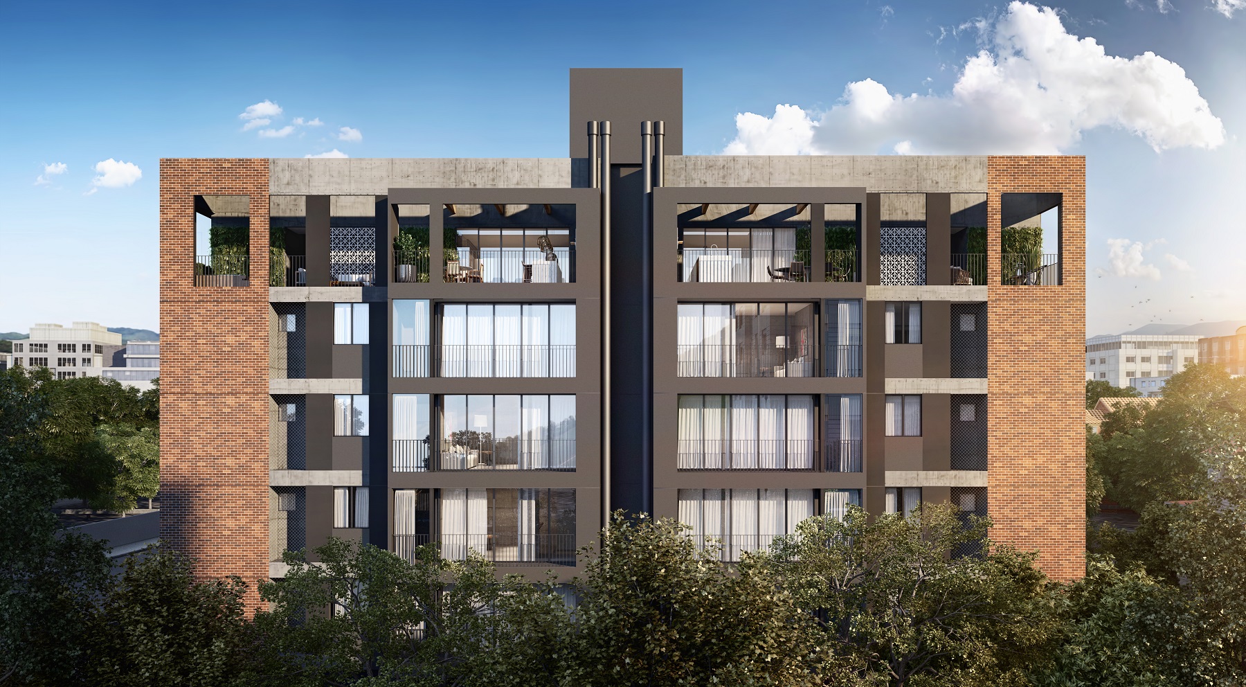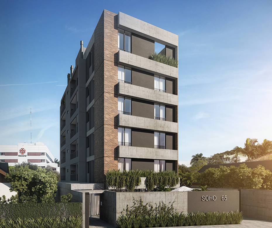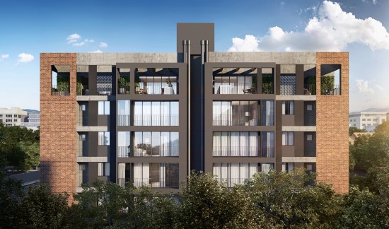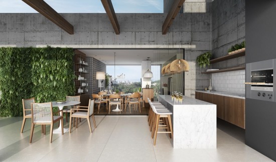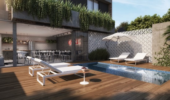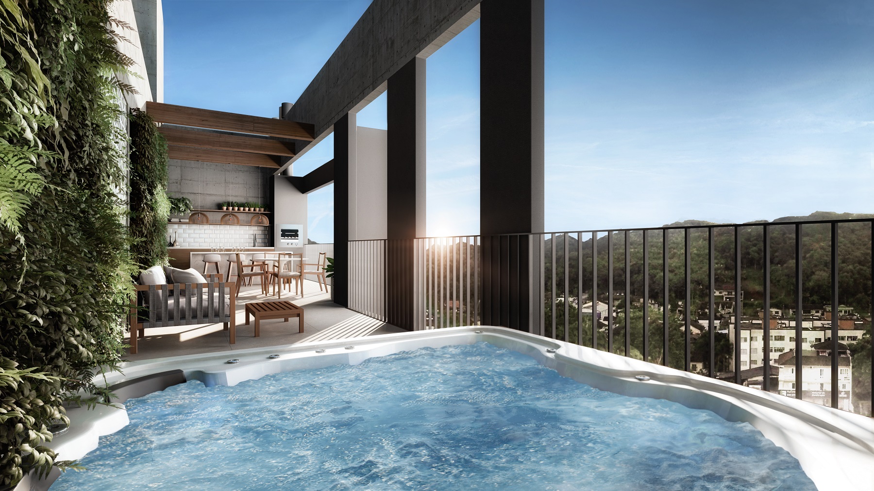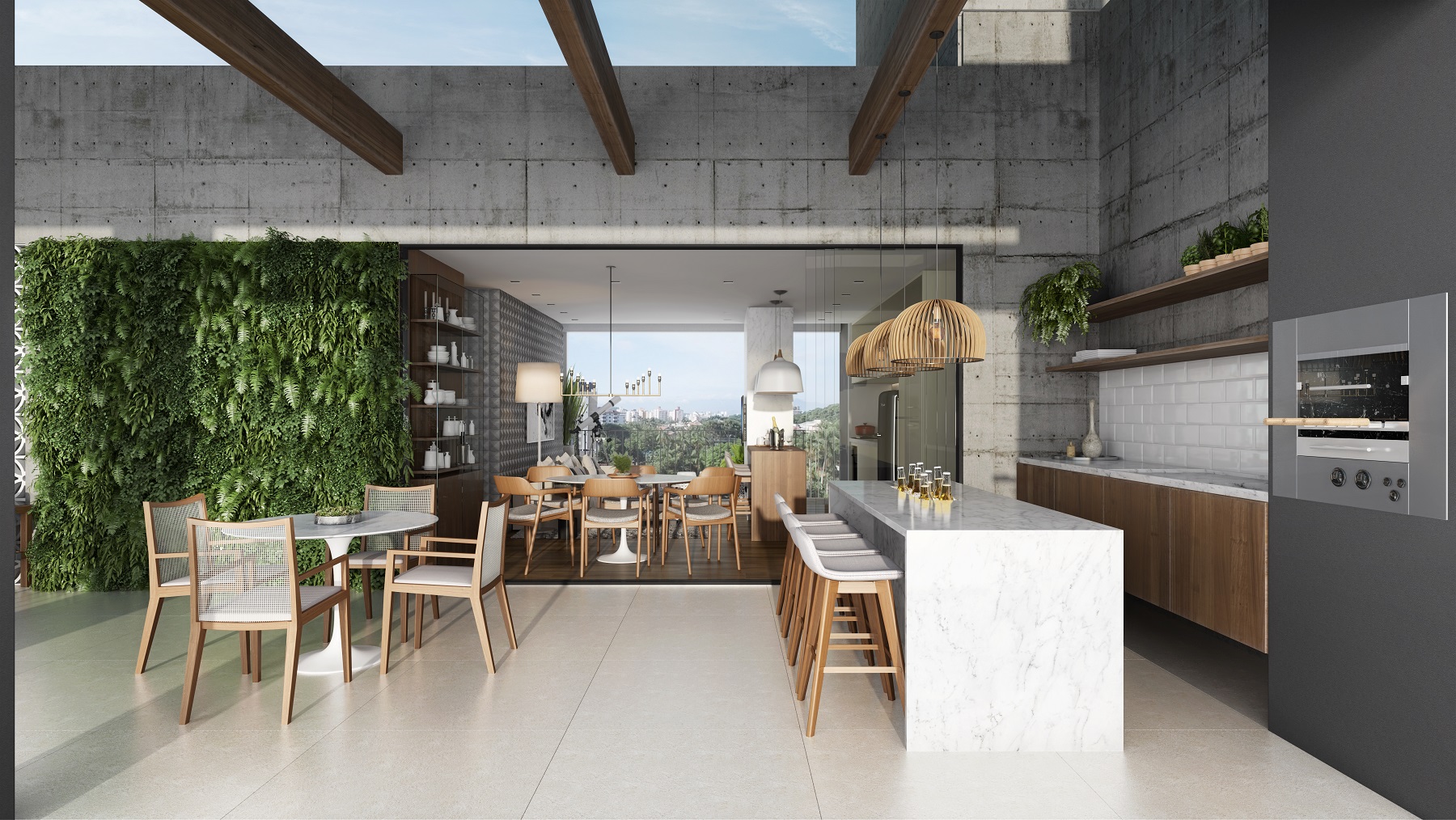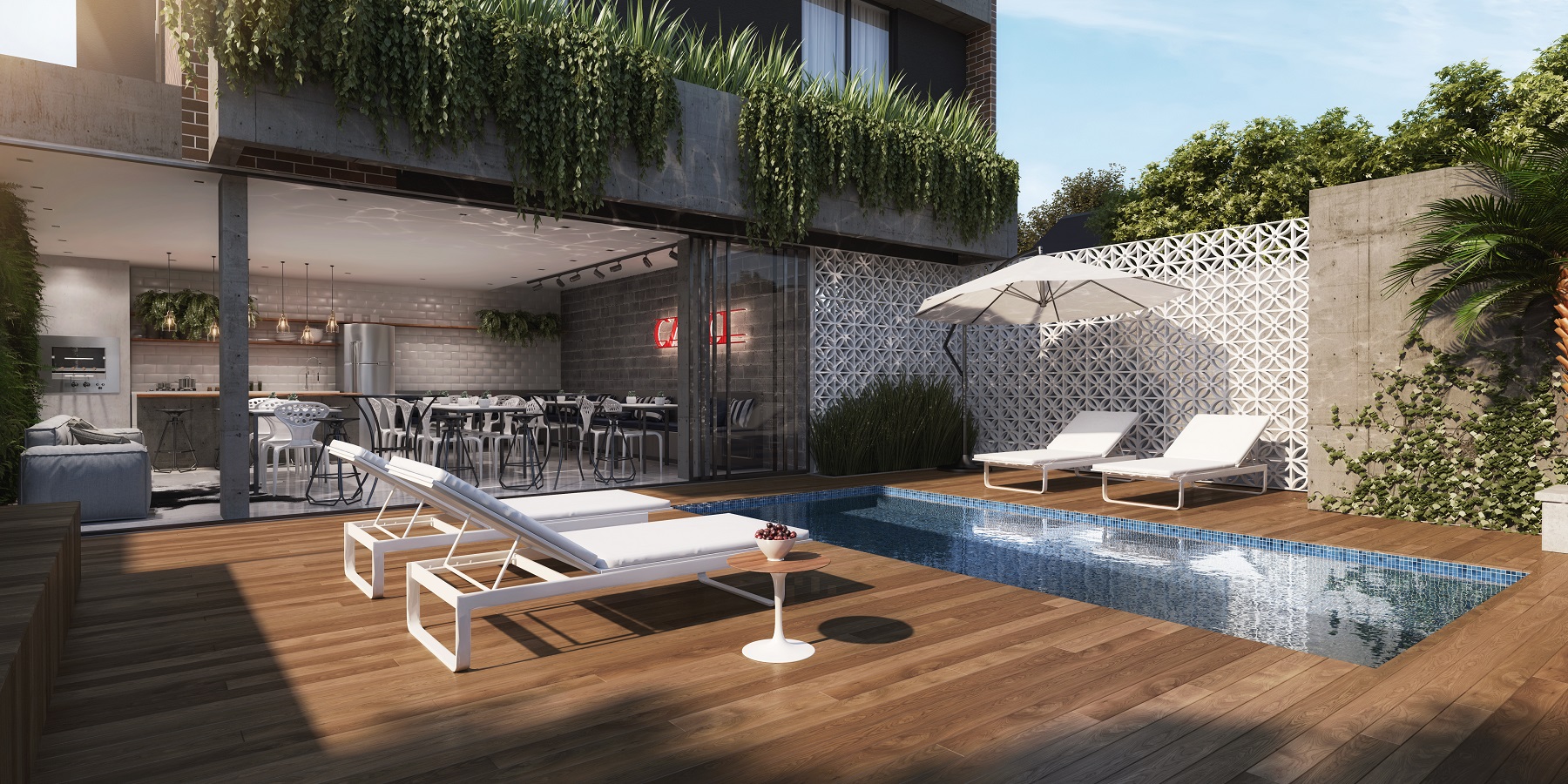 Área interna de 125,10m2 (área privativa de 149,6m2, área total de 185,1m2), com 1 Suíte ampla + 2 Dormitórios, amplo living e cozinha com integração total com área externa (vidros em toda extensão com ampla abertura).